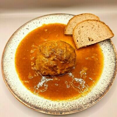 Zwiebelsoße (20 %): Trinkwasser, Schweinefleisch- u. Rindfleischknochen, Zwiebeln, Lauch, Sellerie, Karotten, Tomatenmark, Speisestärke: Reine Maisstärke, Weizenmehl, Rapsöl, Speisesalz, Gewürze.