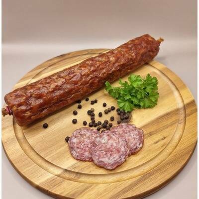 98% Schweinefleisch, Kochsalz, Konservierungsstoff: Kaliumnitrat; Gewürze, Zucker, Buchenholzrauch. Wursthülle nicht zum Verzehr geeignet.